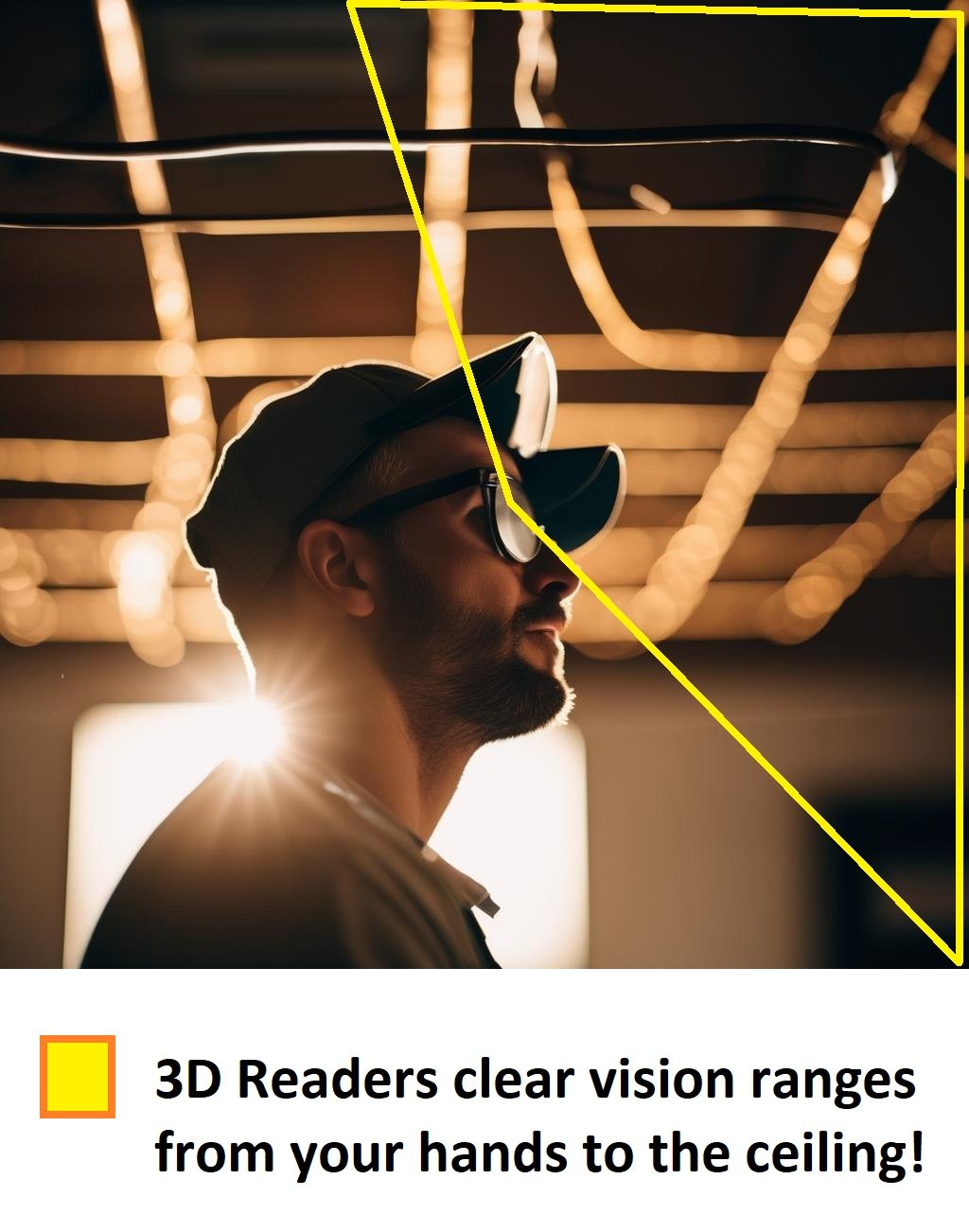3D Readers give you uninterrupted clear vision. In the example above, you can see the ceiling, your hands and your feet clearly.