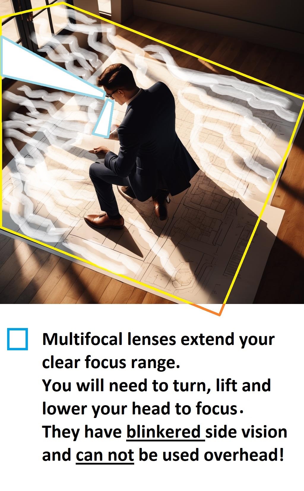 Multifocal lenses extend your vision range. But they blinker your vision and can give you vertigo sensations. When climbing ladders, your feet will be dangerously blurry.