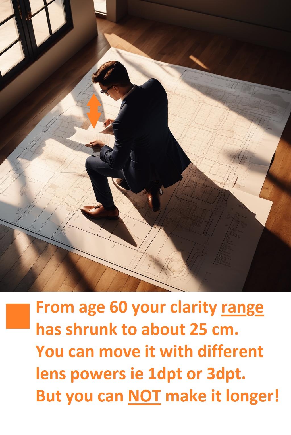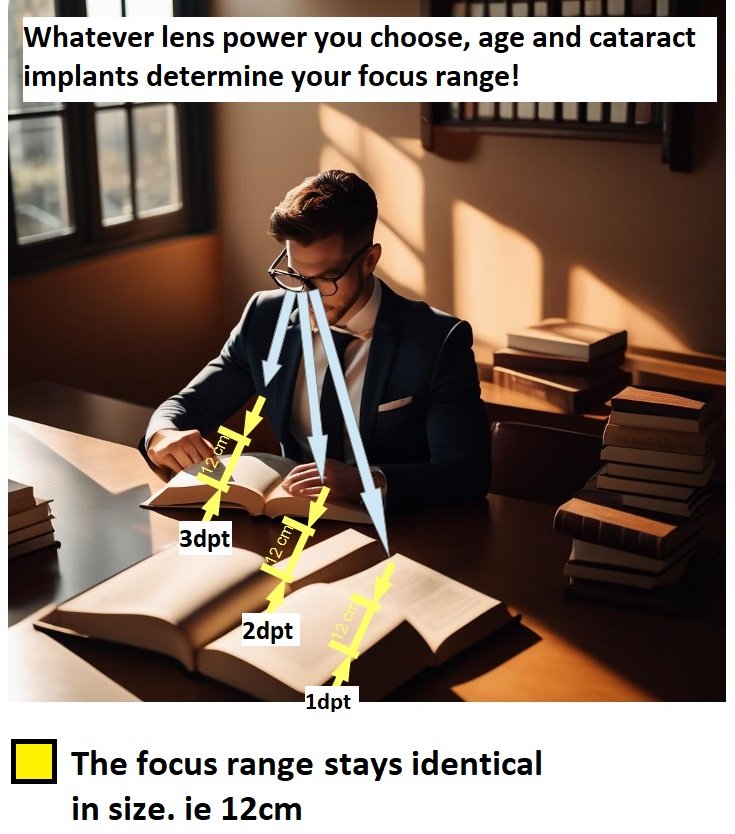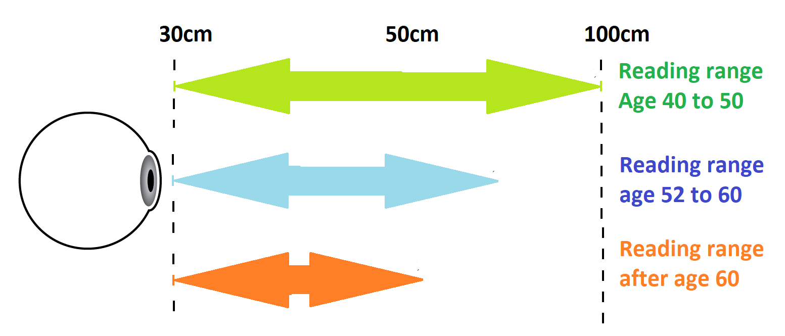 - Reduced Accommodation/Reduced reading range: As people age presbyopia is becoming noticeable after the age of 40 , because the eye’s lens becomes less flexible. Up to the age of 48 to 55, the lens can still change shape to focus a little on close objects within a small, but flexible and automatic focus range. But in late-stage presbyopia, or when cataracts are replaced by plastic lens implants, the focus range is very small. Often less than 10cm in length. Consequently, the eye can not focus at various close distances any more. Wearing single vision reading glasses does not lengthen the focus range. For this you will need multifocus or 3D Reading lenses.