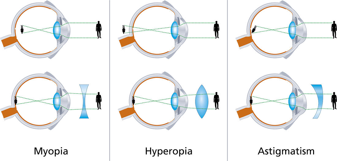 Eye focus problems and their spectacle or contact lens solutions.