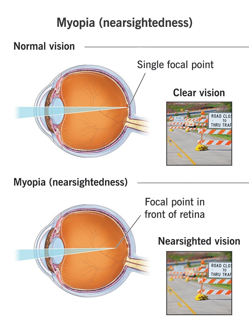 Myopia, commonly known as nearsightedness, is a refractive error of the eyes that causes distant objects to appear blurry while close objects can be seen clearly. This condition occurs when the eyeball is too long or the cornea has too much curvature, preventing light from focusing directly on the retina. The eyes focus system is simply tro strong in power. IF you wonder what is feels like to be myopic. Just look through a magnifier. Close objects will be clear and distant object blurry.